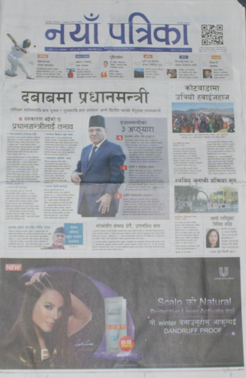 काठमाडौं । आइतबार काठमाडौंबाट प्रकाशित दैनिक पत्रपत्रिकामा प्रधानमन्त्री पुष्पकमल दाहाल दबाव र तनाव भएको समाचारदेखि अनिश्चयबीच दलहरु निर्वाचनको अभियानमा लागेकोसम्मका समाचारले फ्रन्टपेजमा स्थान पाएका छन् ।