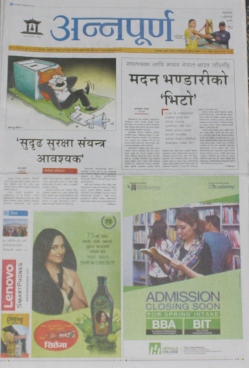 नेपाल समाचारपत्र दैनिकमा नेपाली नर्सहरुको पीडासम्बन्धी समाचारले महत्वपूर्ण स्थान पाएको छ । त्यस्तै ‘चुनावबाट को भाग्दै ?’ शीर्षकको समाचार पनि फ्रन्टपेजमा छापिएको छ ।