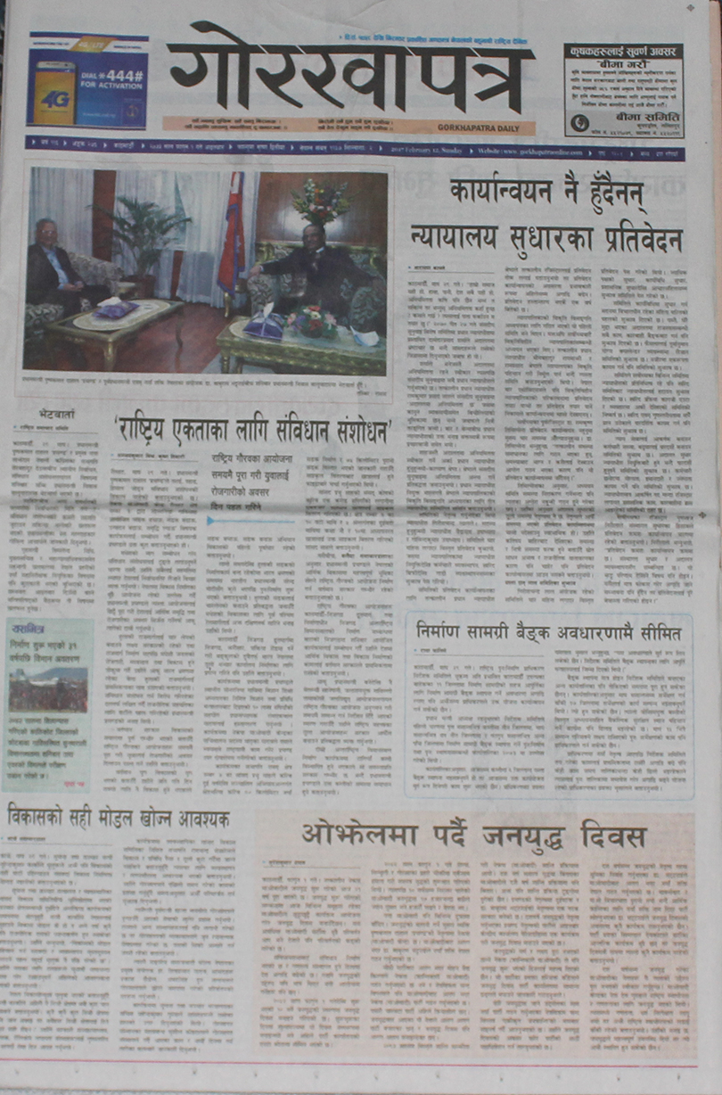 न्यायालय सुधारका प्रतिवेदन कार्यान्वयन नभएको समाचार र जनयुद्ध दिवस ओझेलमा पर्दै गएको समाचारलाई गोरखापत्र दैनिकले फ्रन्टपेजमा छापेको छ ।